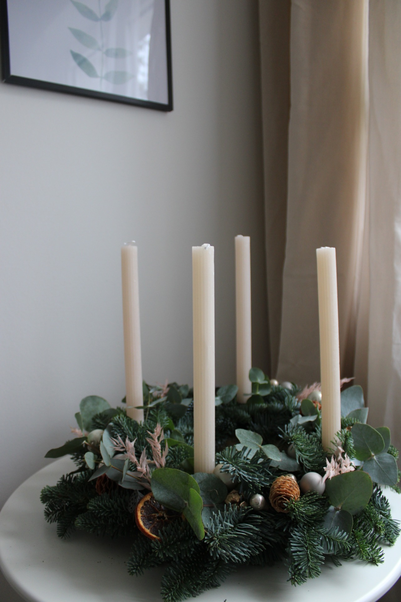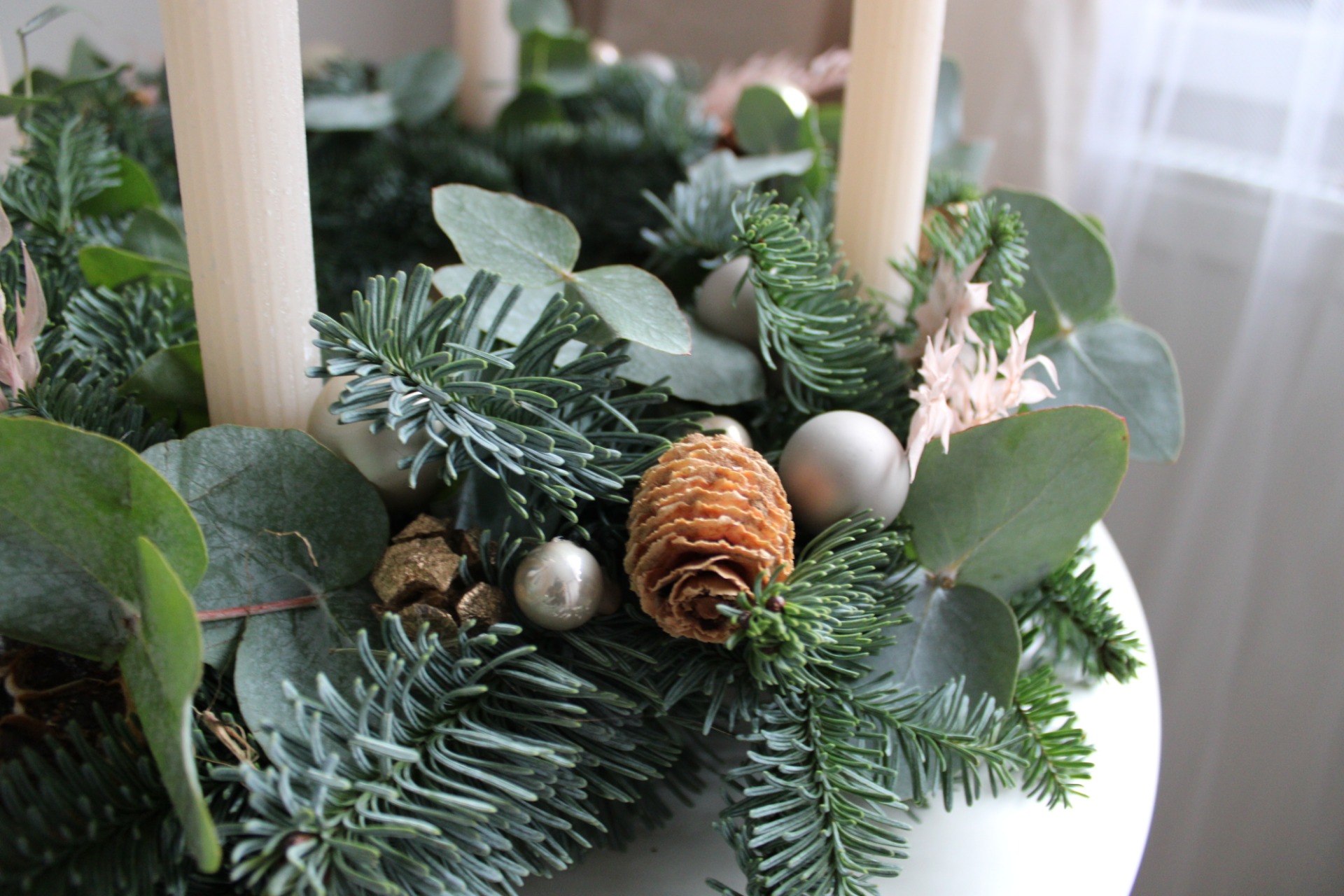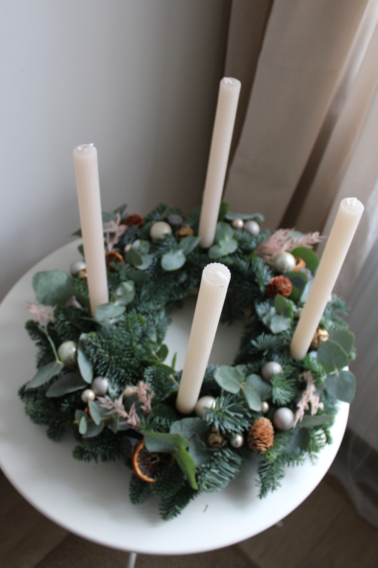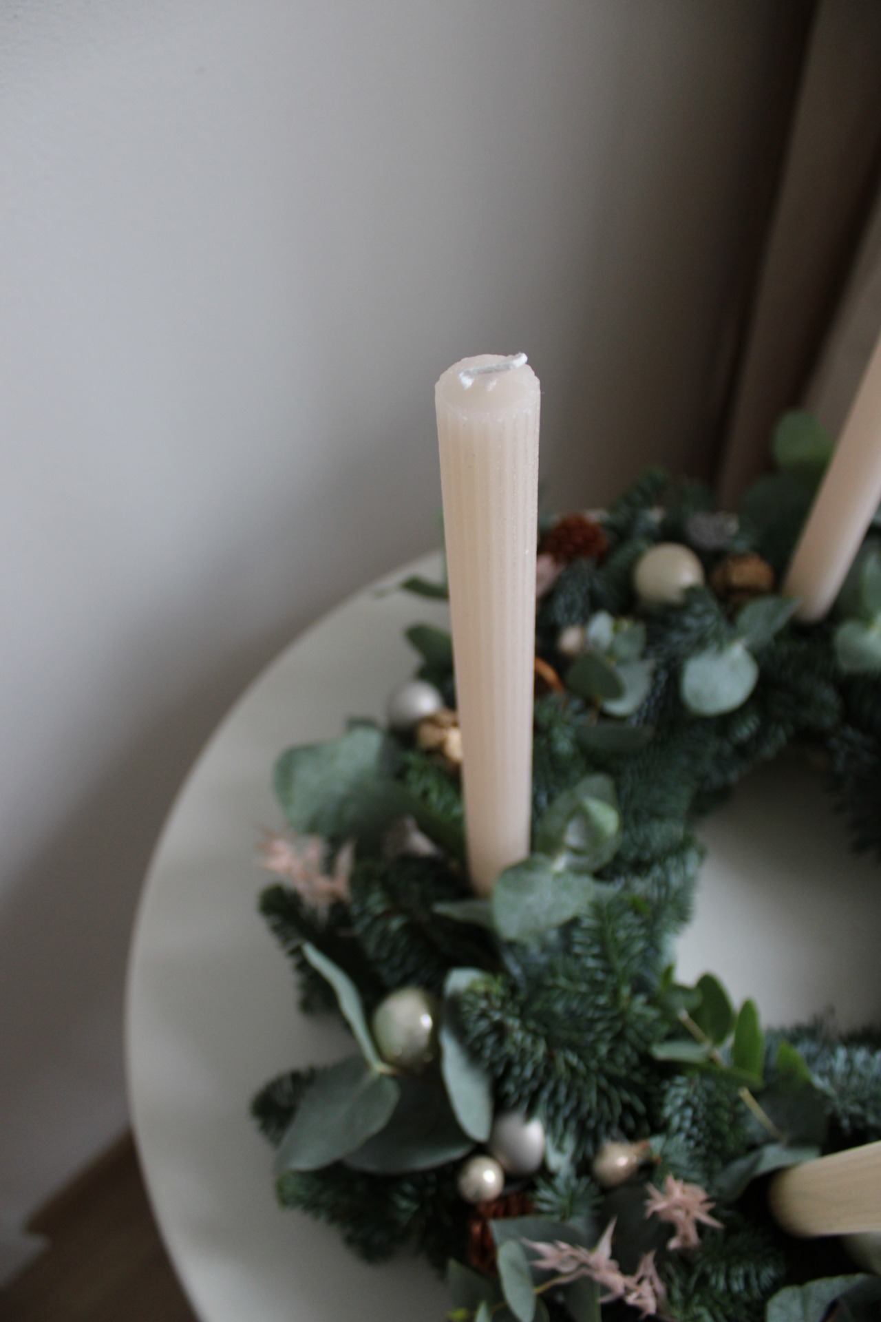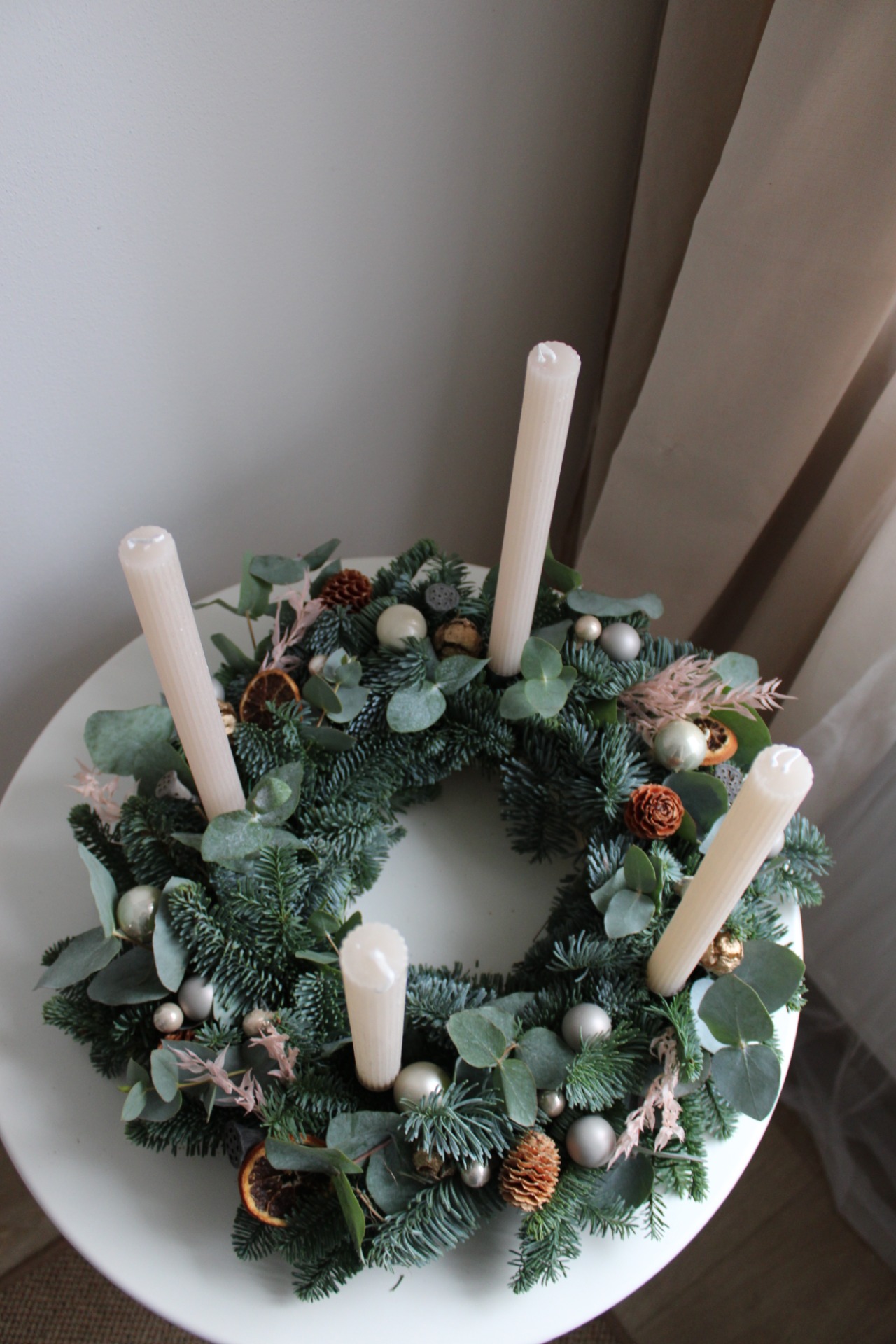 Materiál: Čerstvá jedle Nobilis (neopadavá), eukalyptus, ozdoby v krémové a perleťové. Součástí jsou 4 kónické svíčky a držáky (zápichy).