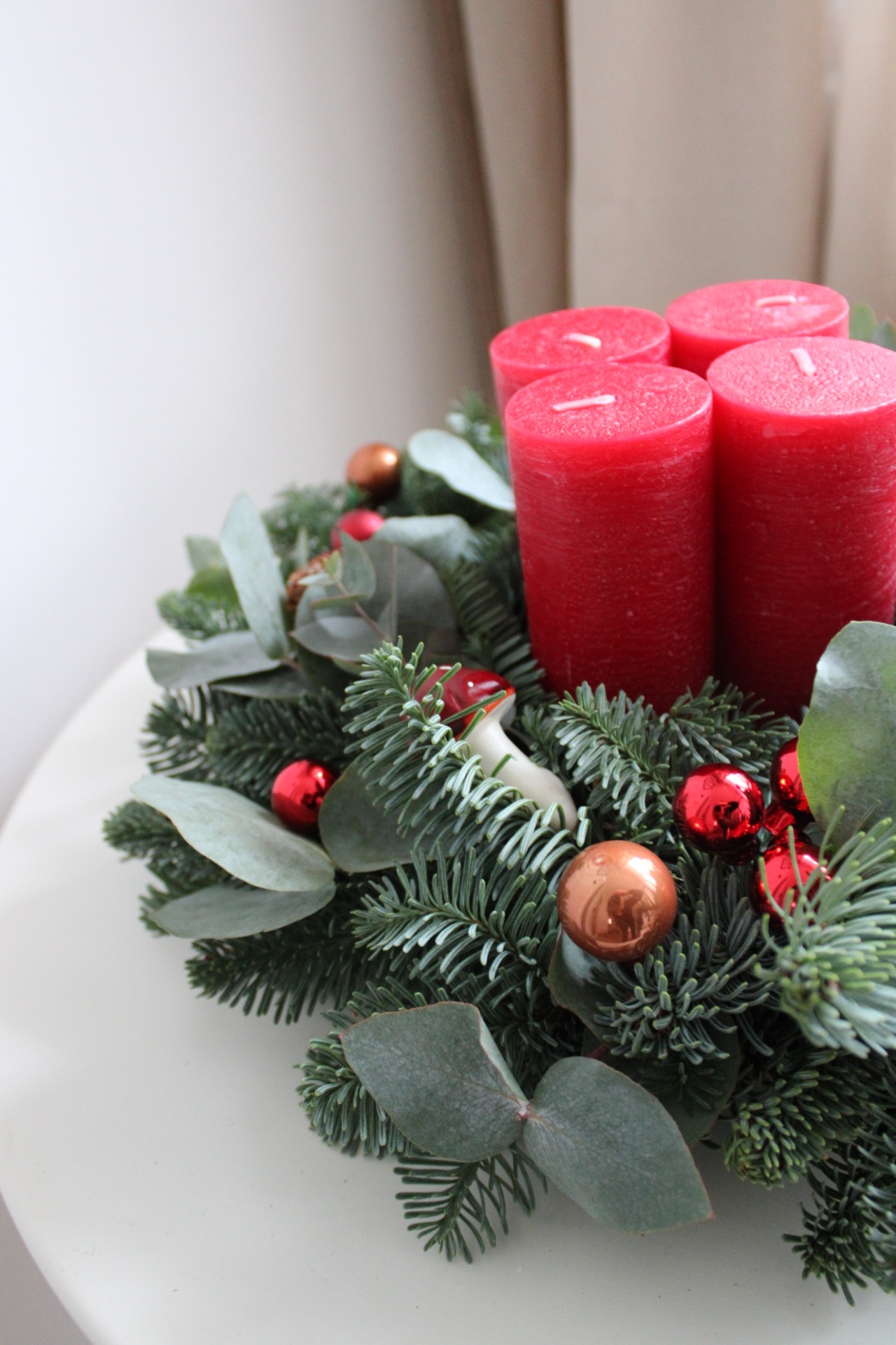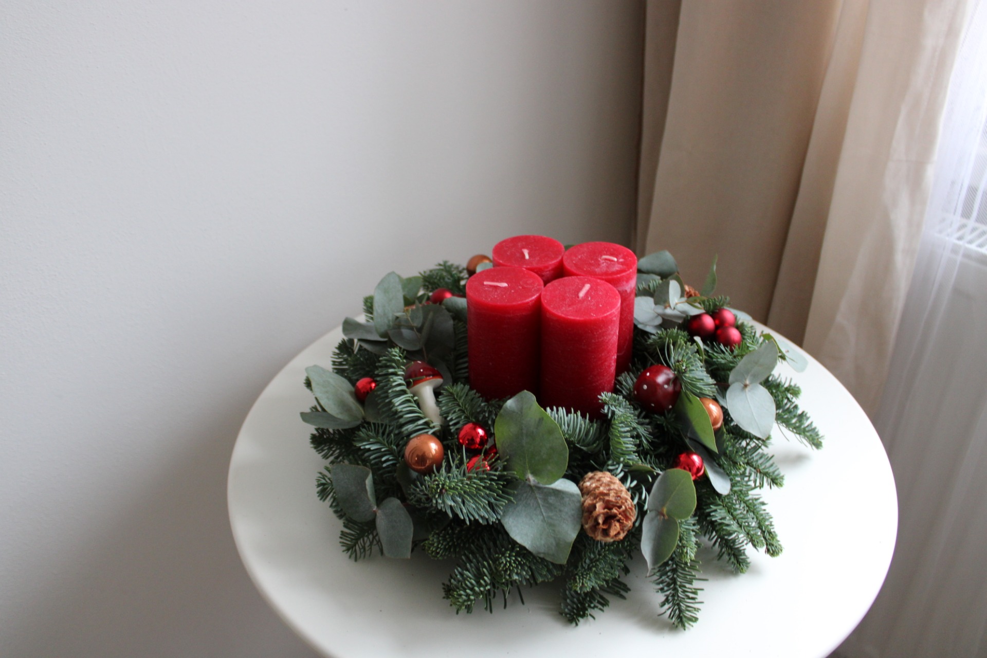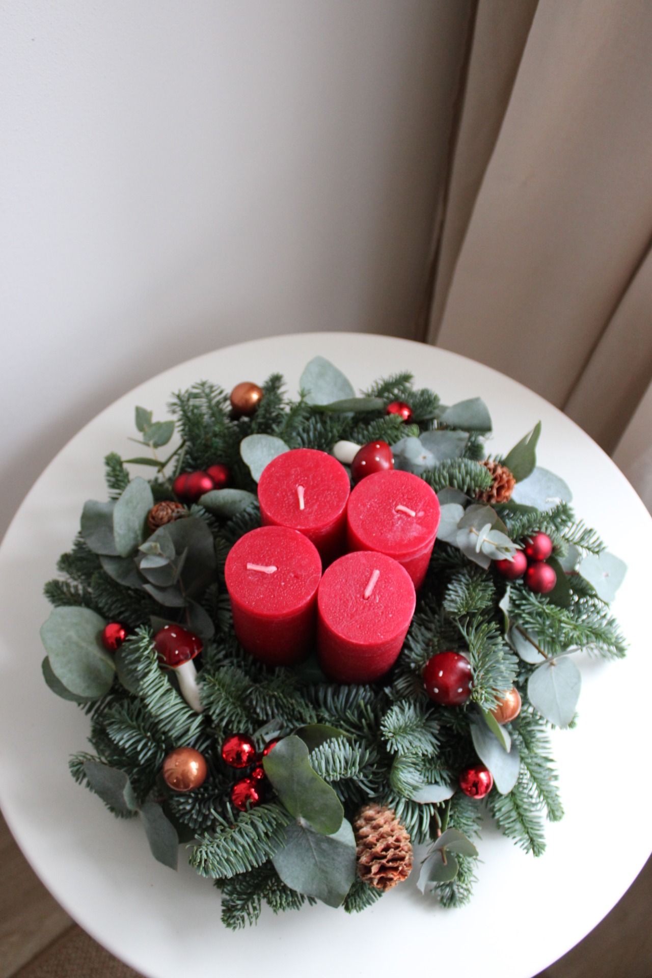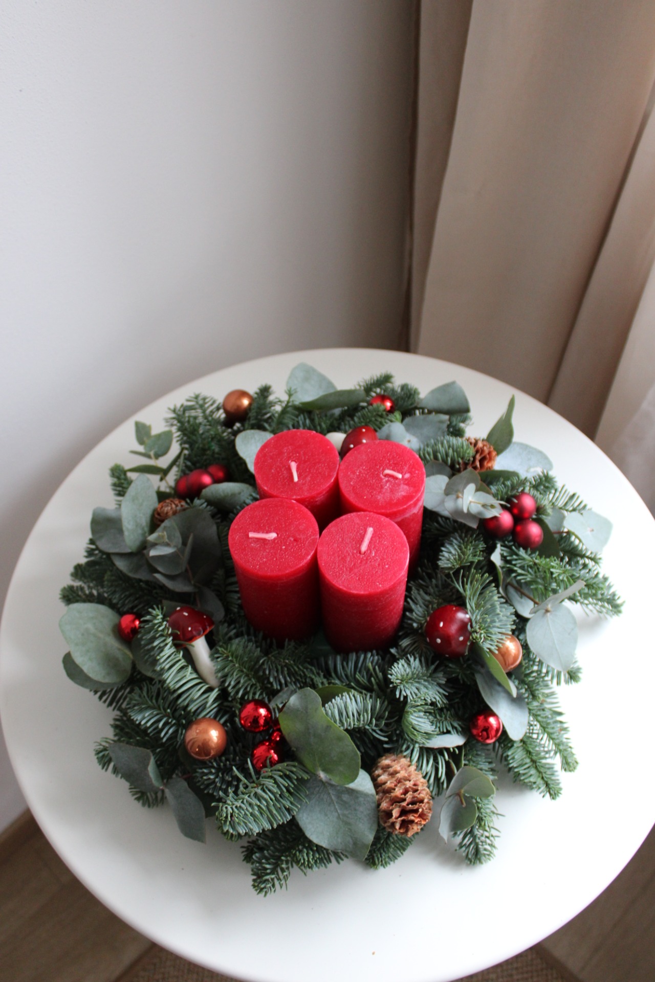 Sáhněte po nadčasové eleganci s naším Malým červeným adventním věncem, pravou klasikou Vánoc. Věnec je pro vás ručně vázán z neopadavé dánské jedle Nobilis a čerstvého eukalyptu, což zaručuje dlouhou životnost.