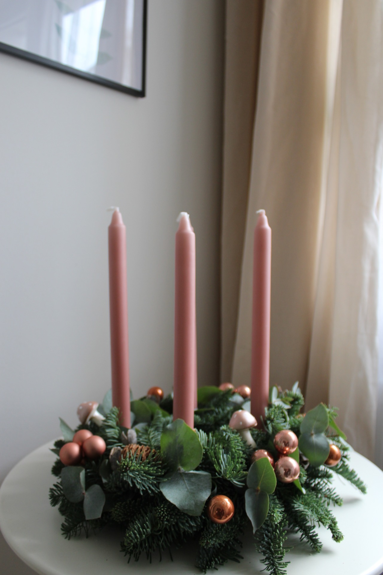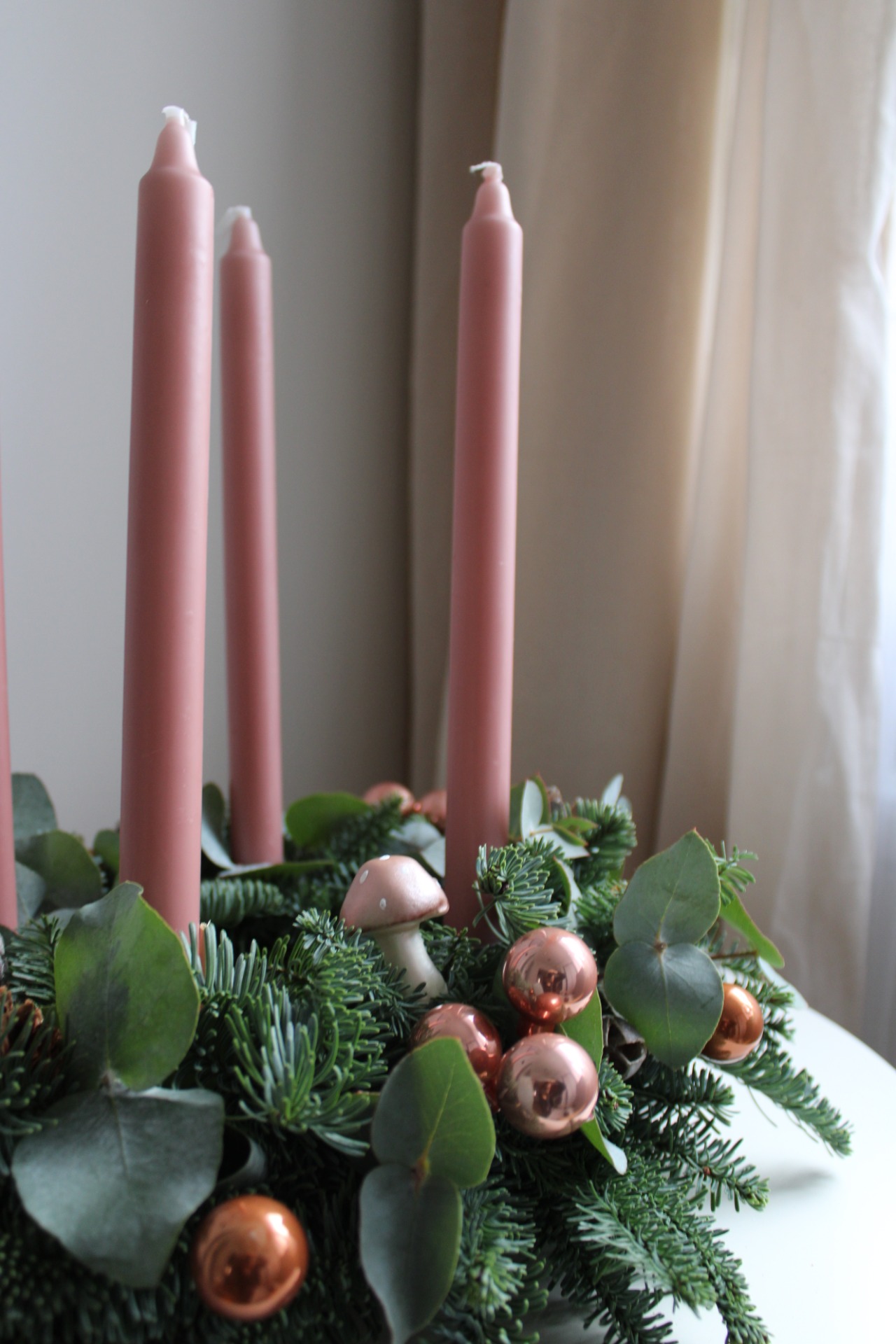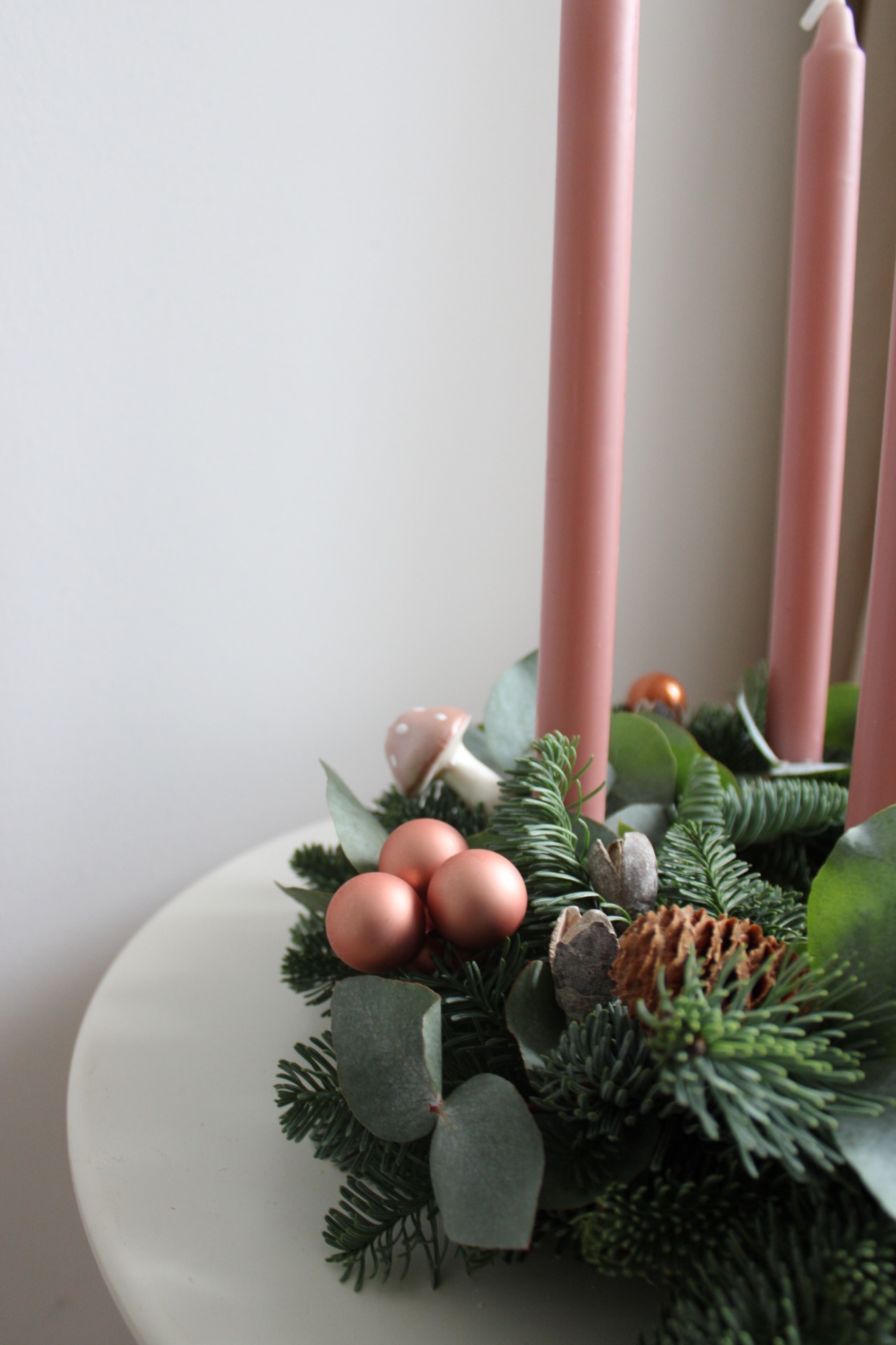 Materiál: Čerstvá jedle Nobilis (neopadavá), eukalyptus, ozdoby v růžové a růžovo-zlaté, kovové zápichy.