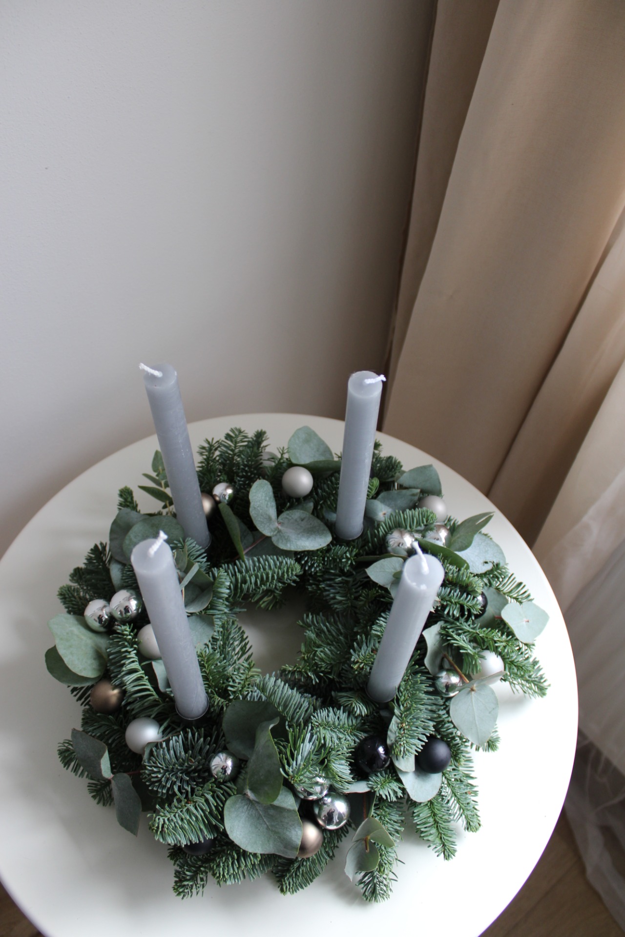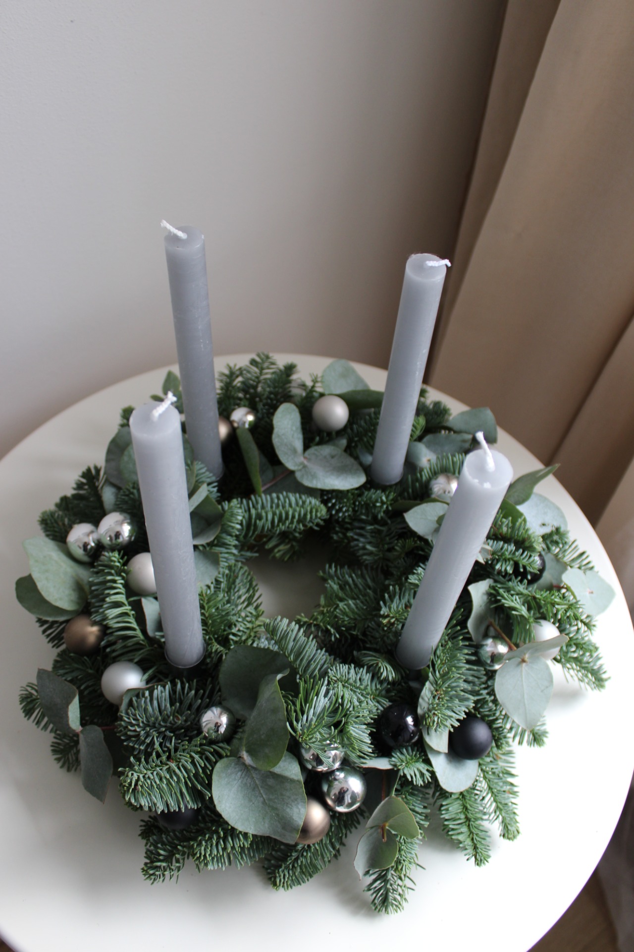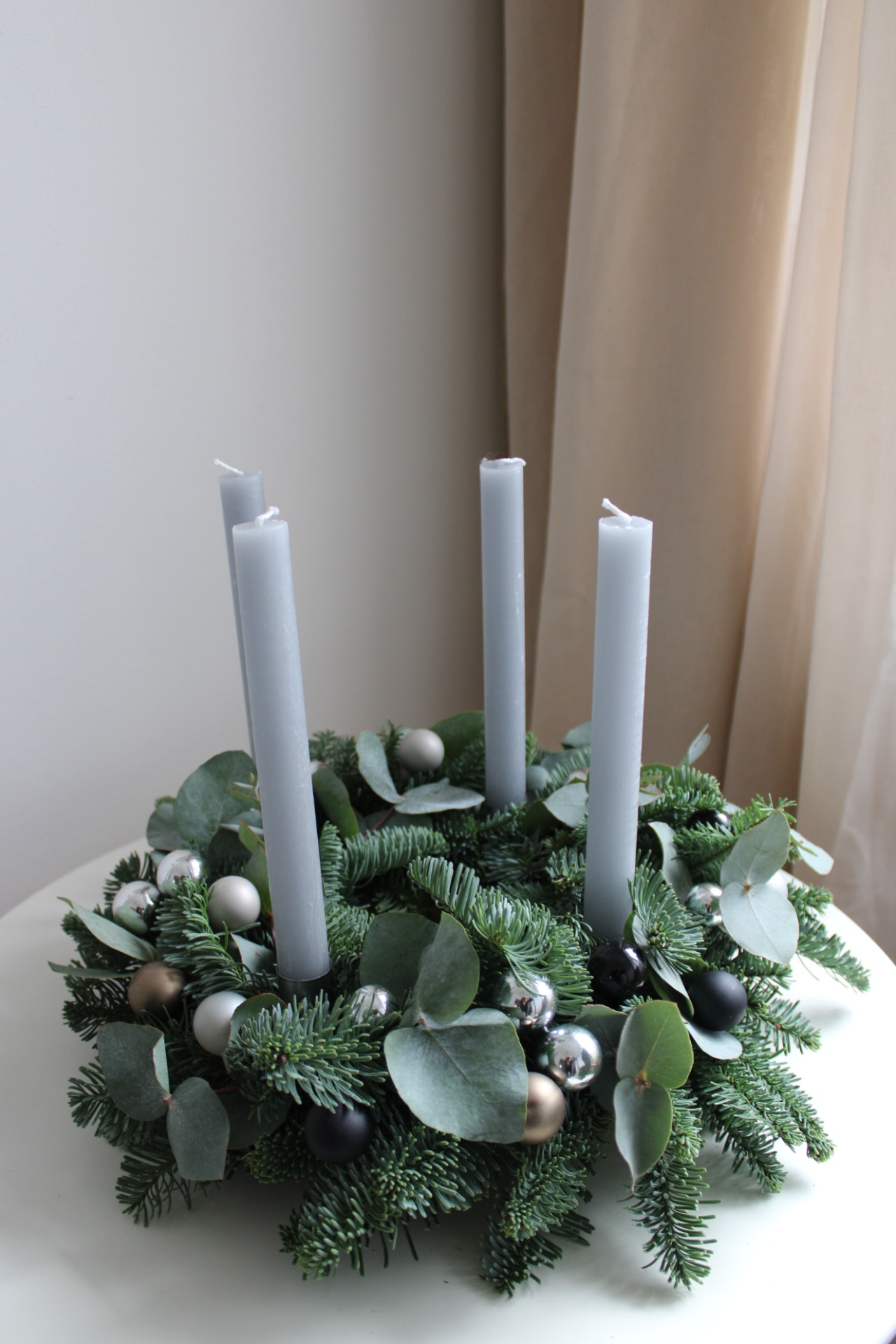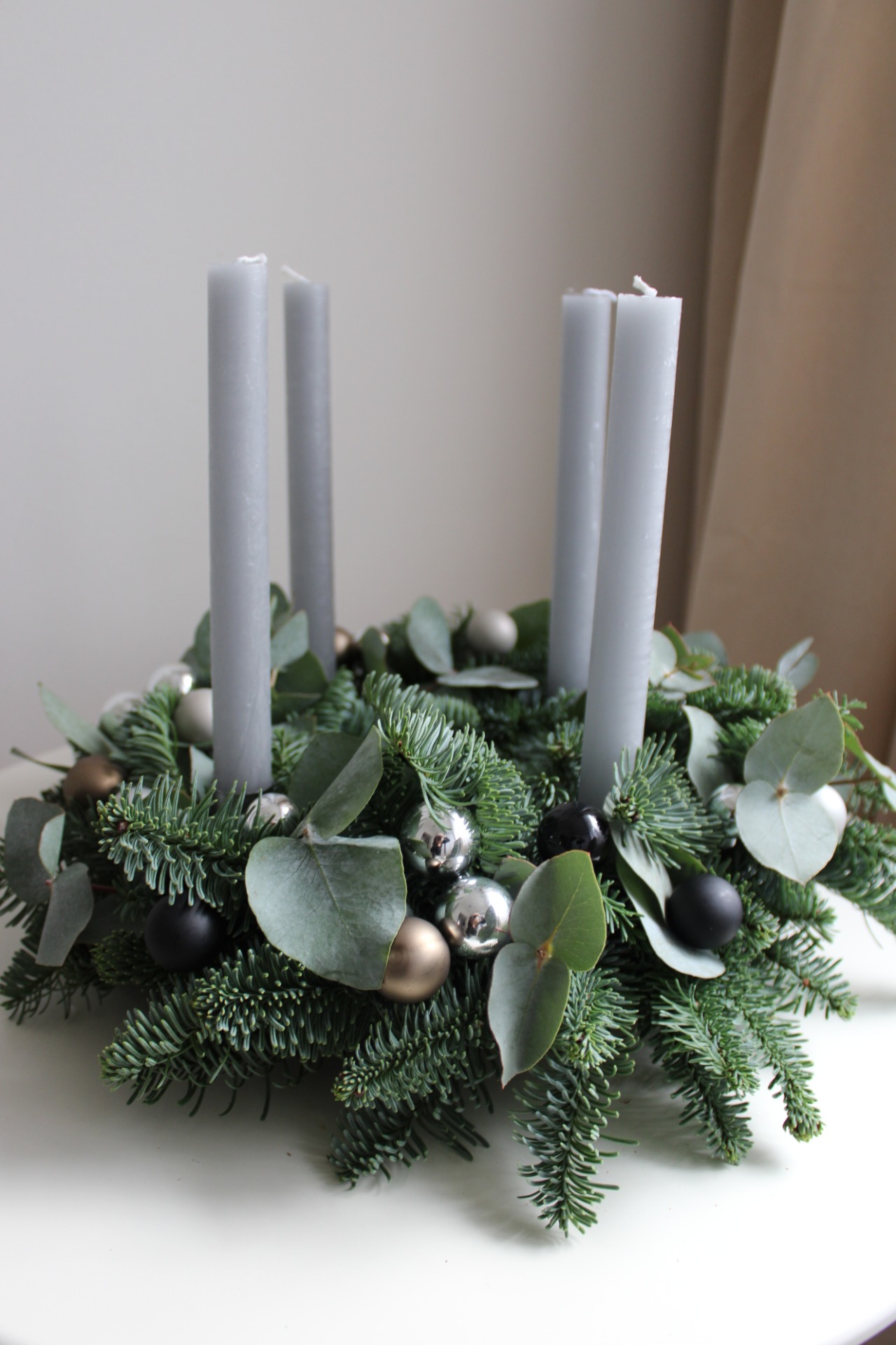 Materiál: Čerstvá jedle Nobilis (neopadavá), eukalyptus, kovové zápichy.