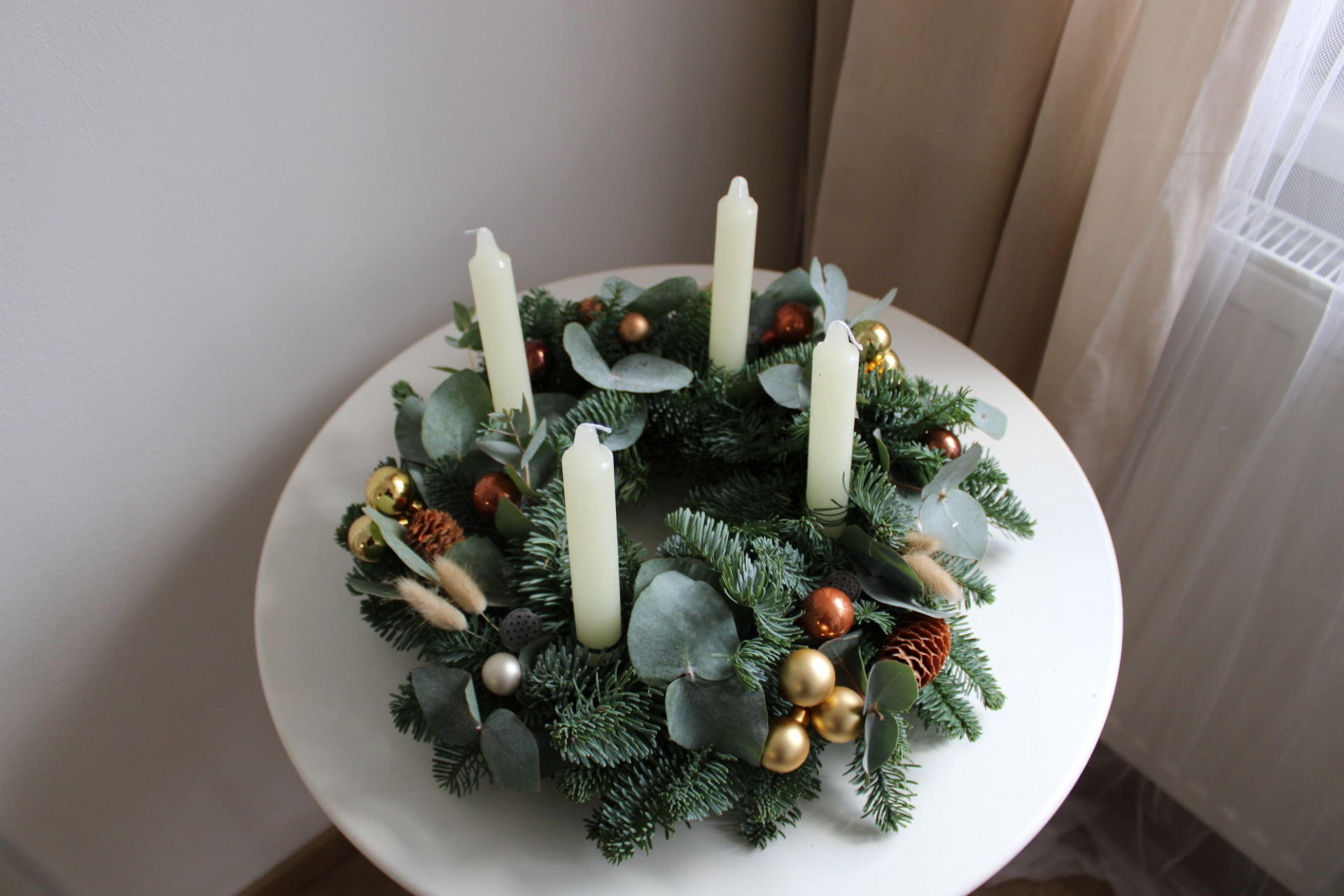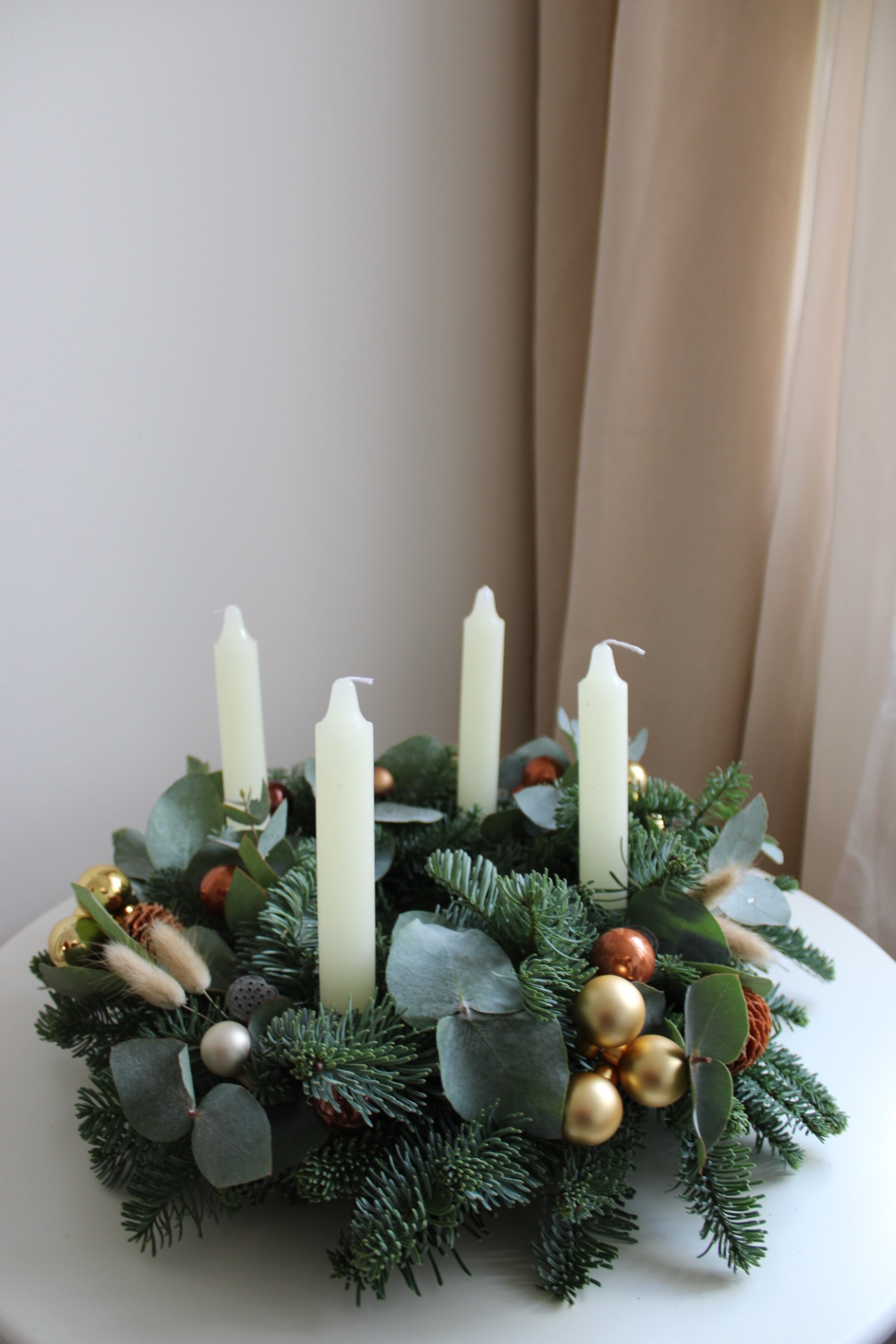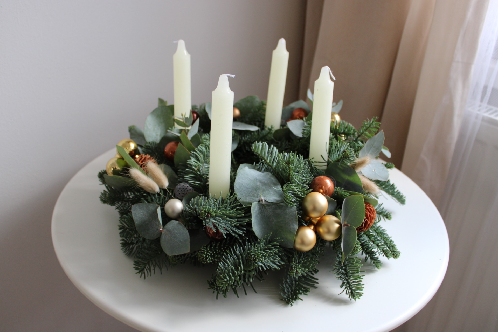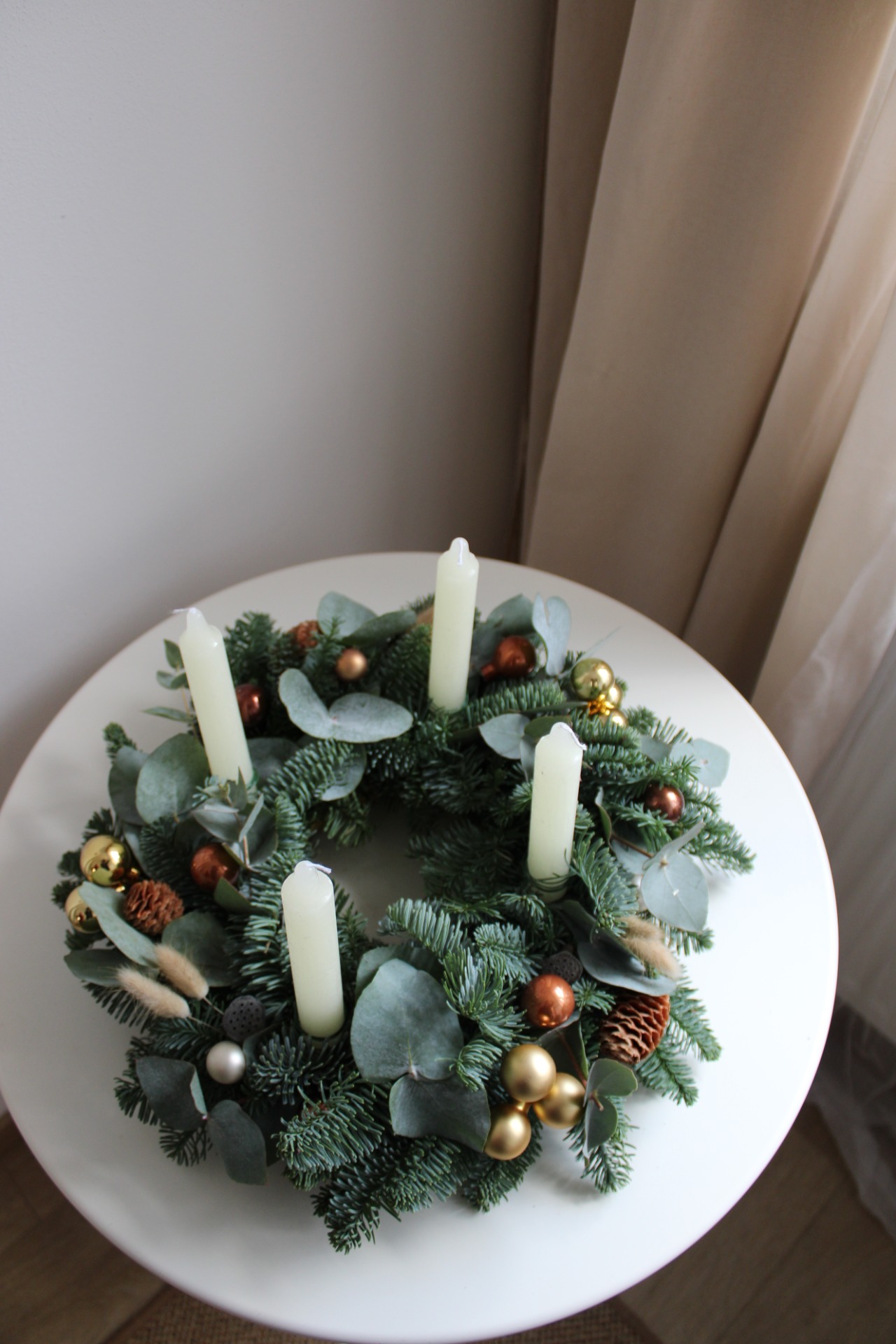 Dopřejte si luxusní a trvanlivou vánoční dekoraci s naším Malým zlatým adventním věncem. Věnec je ručně vázán z neopadavé dánské jedle Nobilis a čerstvého, voňavého eukalyptu, což zaručuje dlouhou životnost a nádhernou vůni po celý advent.