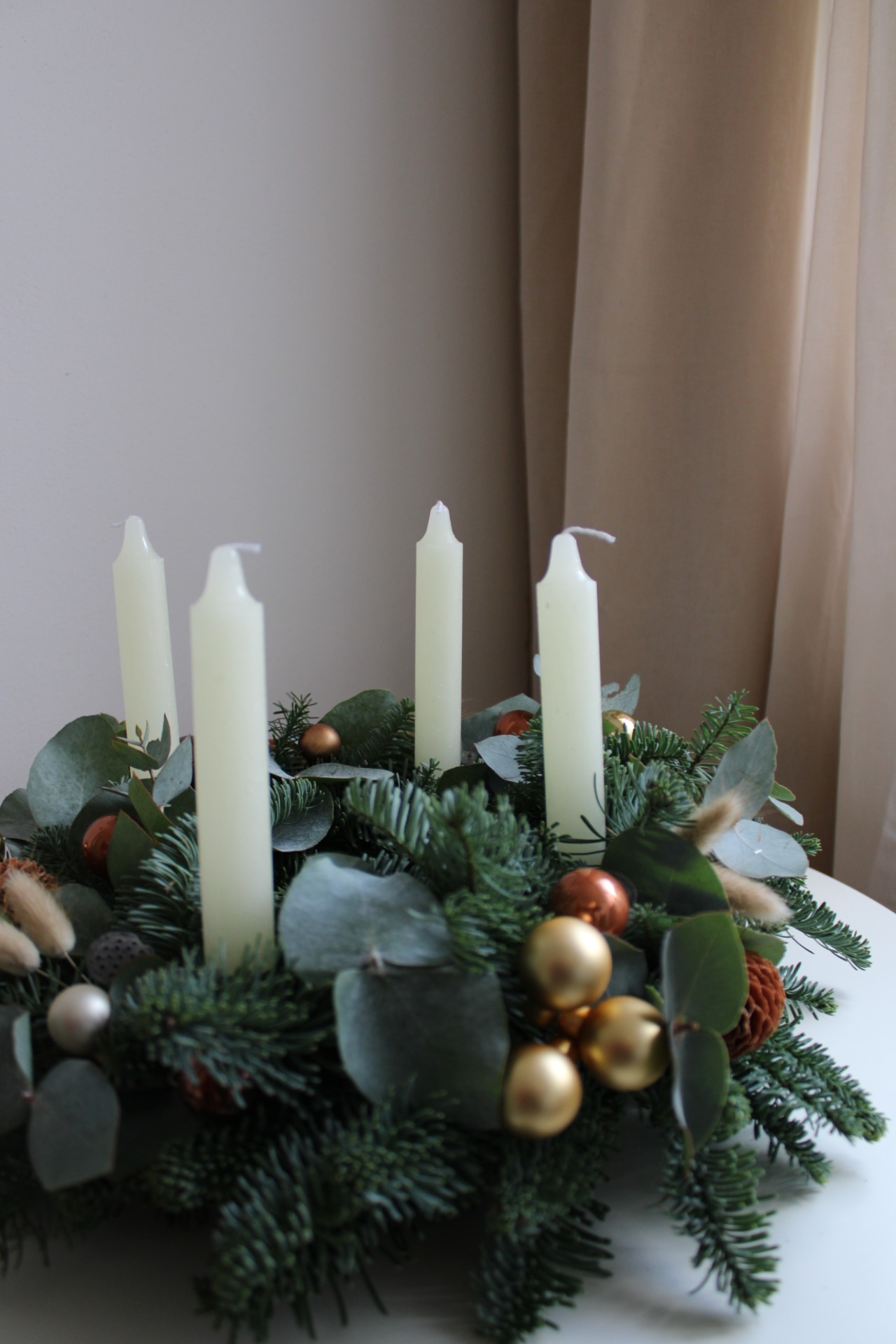 Materiál: Čerstvá jedle Nobilis (neopadavá), eukalyptus, kovové zápichy.