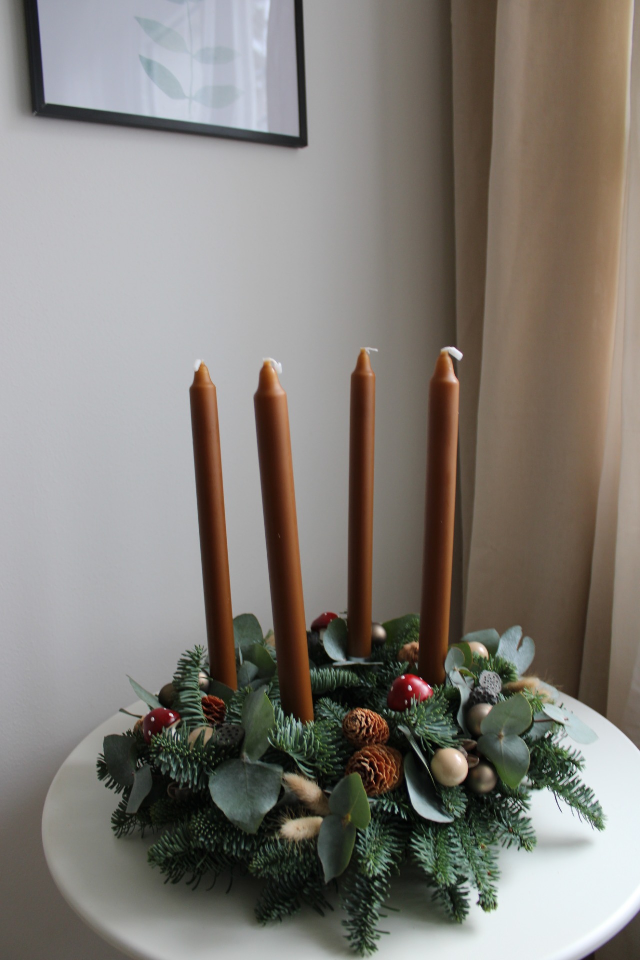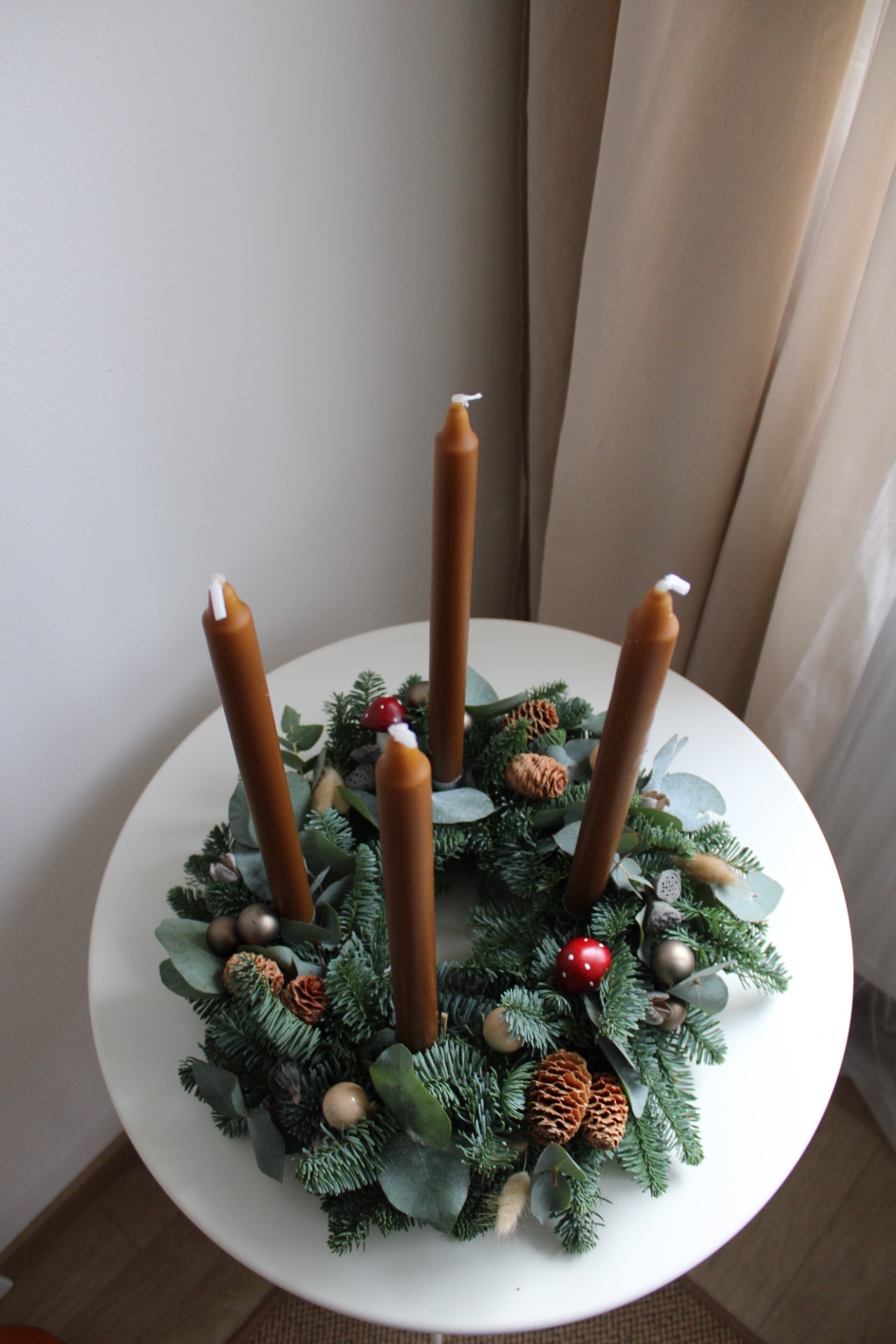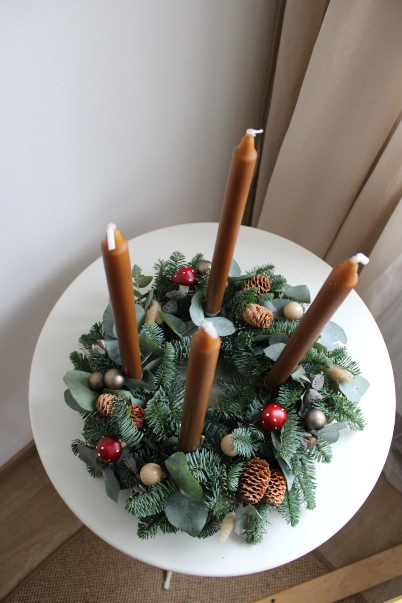 Průměr věnce je cca 35 cm (korpus 20 cm), perfektní jako decentní střed stolu. Věnec je zdoben výhradně v přírodních tónech, s použitím šišek, sušených plodů, skořice a minimum baněk, ideální pro minimalistický a rustikální styl. Součástí balení jsou kónické svíčky a kompletní sada bezpečných kovových zápichů na svíčky pro tradiční advent.